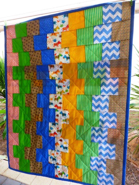 I have been working on a quilt to raffle to raise funds to pay for the wadding for our charity quilts. I had some nice zebra print and teamed it with some bright colours. The quilt design is the Stacks quilt from the book Growing Up Modern by Allison Harris. What a great simple and modern pattern!