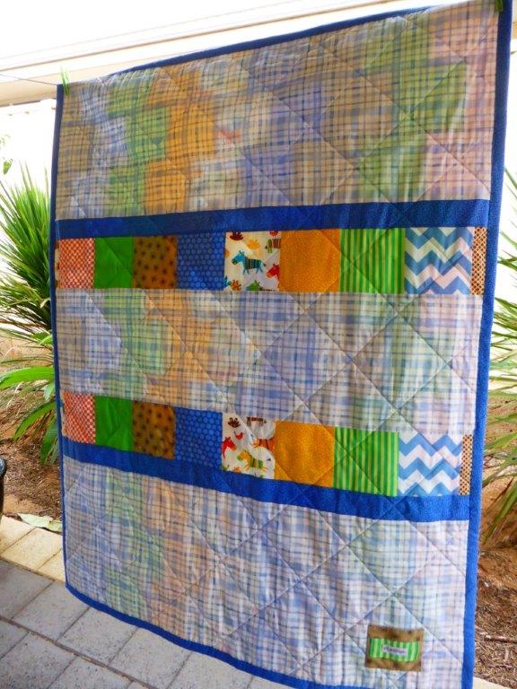 I made the squares 5 1/2″ each and did 11 stacks high by 9 blocks wide. The matching cushion was made with 3 1/4″ squares with the scrap from the quilt. The backing also had two rows of fabric squares so the quilt is reversible, nice to look at both ways. The quilt was quilted across the squares.